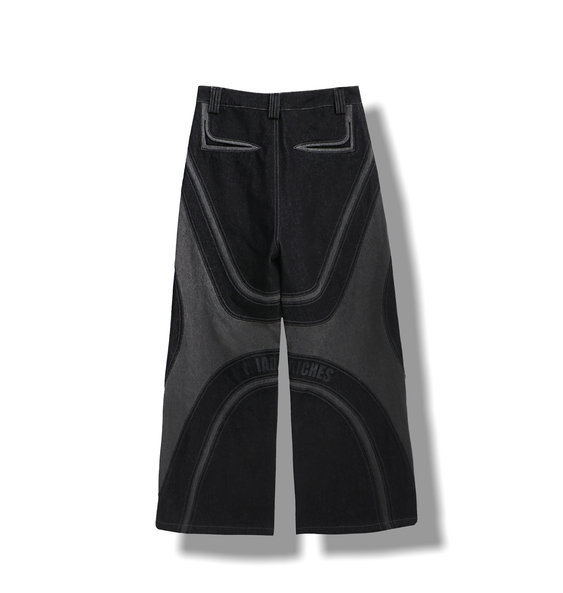 A standout piece in the Myriad Flux Collection. These pants feature a striking blend of curved paneling and layered shades of black and charcoal, creating a bold, futuristic. Crafted from premium denim, the Flux Vortex Pants offer a relaxed fit with wide legs, merging comfort with high style. A go-to piece for anyone embracing modern street style with a nod to the Y2K era.